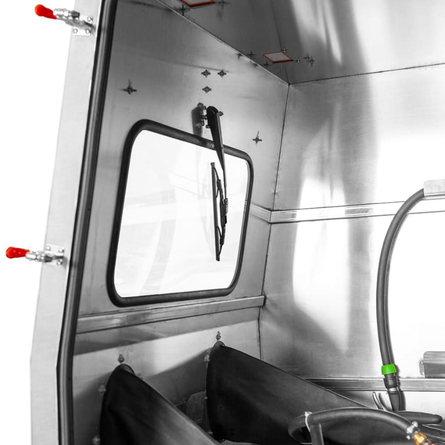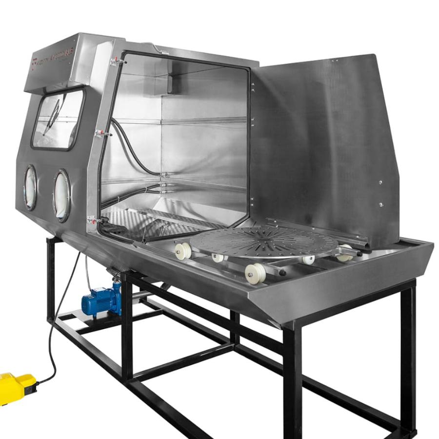 Процесс очистки максимально простой. Чистящий раствор со стеклянной дробью подается насосом по трубопроводу в пистолет, откуда через форсунку, разгоняемый сжатым воздухом, выходит под давлением. Струя высокого давления с абразивом воздействует на загрязнение деталей, находящихся в корпусе камеры. Камера оснащена дверью, выкатным столом, камерными перчатками, стеклом и подсветкой. Пуск процесса очистки осуществляется педалью. После окончания процесса очистки деталь готова к дальнейшим технологическим операциям.