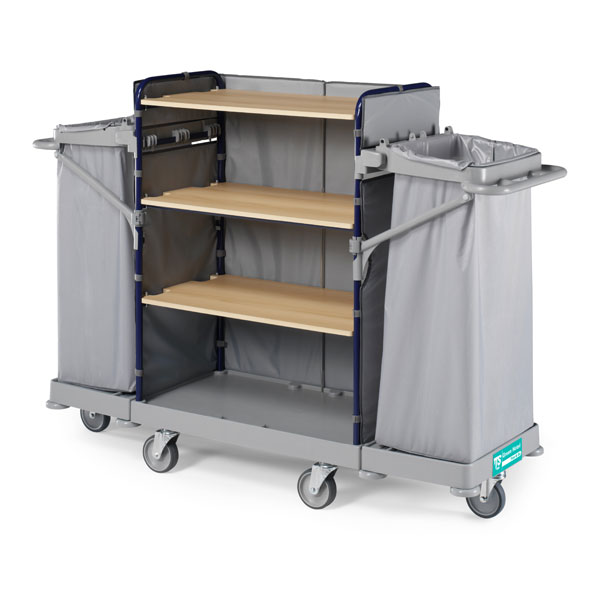 Тележка предназначена для работы горничных по перевозке чистого белья, сбора грязного белья, в гостиницах, санаториях, больницах и т.д. Данная тележка позволяет обслуживать от 12 до 15 номеров на одном этаже.